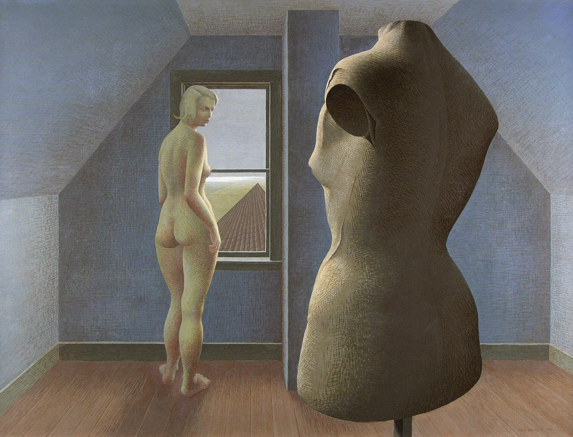 ChatGPT: Colville’s style remained remarkably consistent: clean, figurative, and precise. He was deeply influenced by geometry, proportion, and photography. What did evolve was his emotional tone — earlier works feel slightly more observational, while later works become more psychologically charged, especially with repeated motifs of aging, death, and the passage of time. His technical precision stayed, but his inner world grew more prominent.