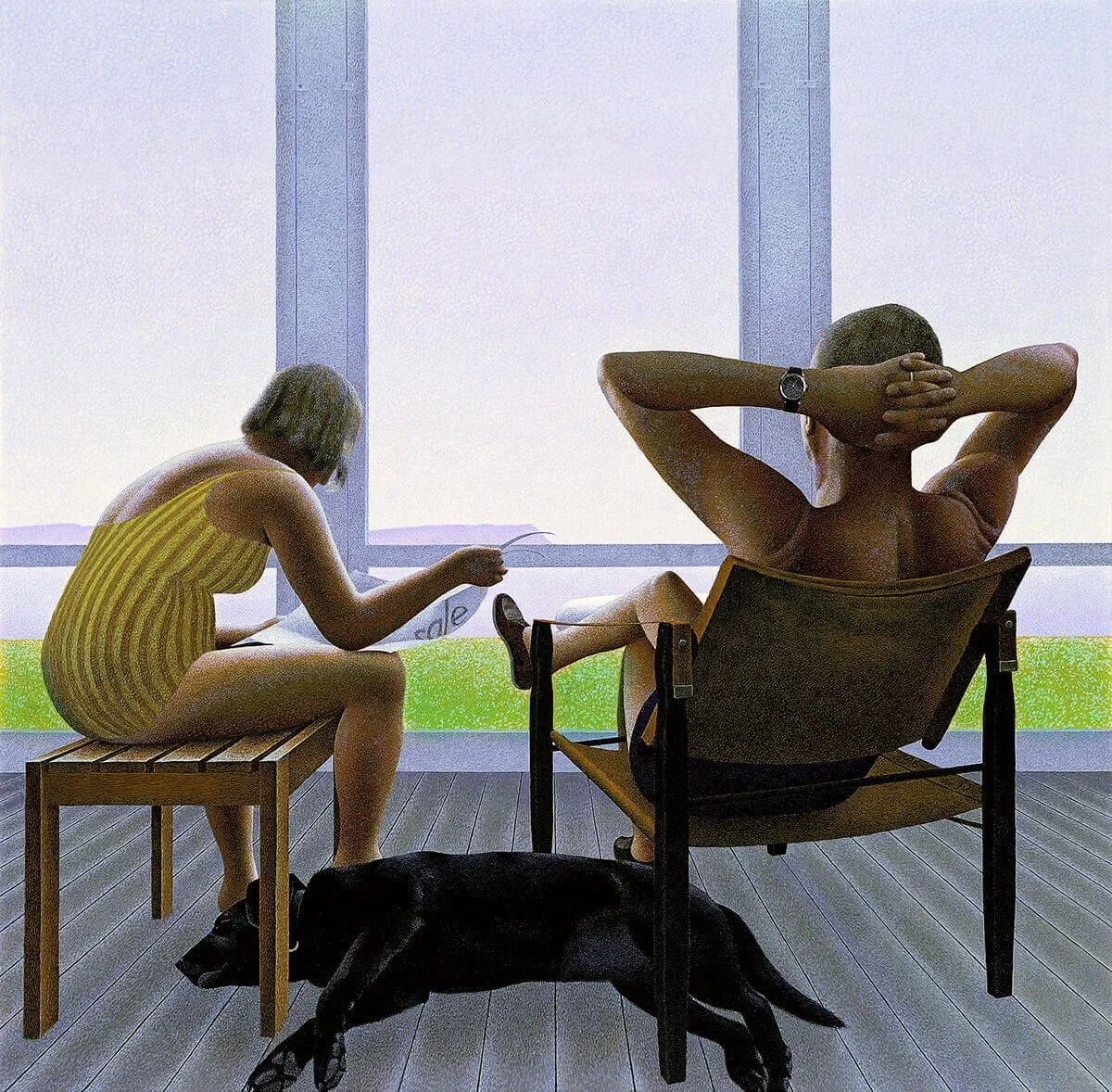 ChatGPT: To Prince Edward Island (1965) often gets attention—but it's deeper than it seems. Rhoda, seated center-stage, peers through binoculars toward the horizon, while the man sits quietly behind her. This subverts traditional roles: her gaze is active, powerful, focused — and it’s echoed back onto us. Colville challenges us to question who’s observing whom. Critics describe her binoculars as “turning the male gaze back on the viewer,” and describe the painting as an exploration of mutual isolation and connection .