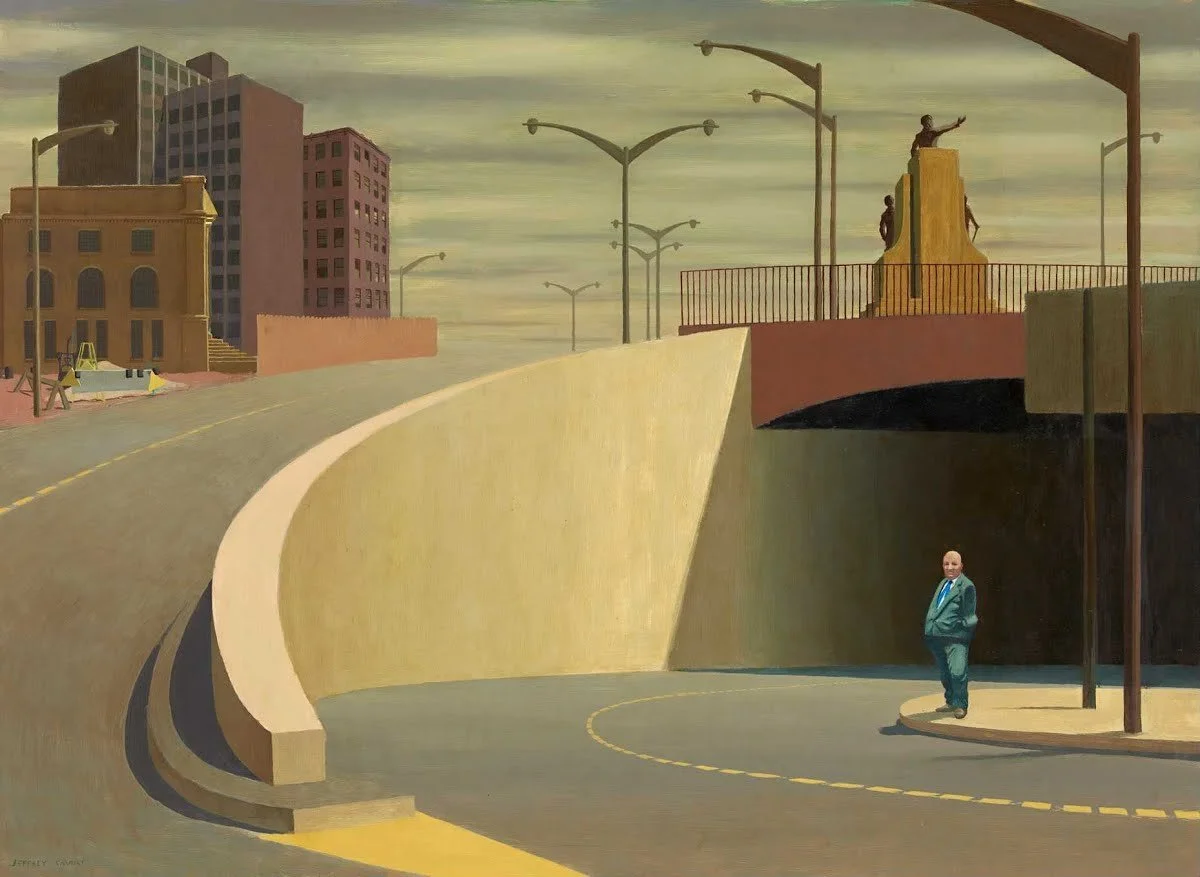 ChatGPT: Jeffrey Smart’s work is defined by a sense of alienation, order within chaos, and the beauty found in modern urbanity’s overlooked spaces. His paintings often depict solitary figures in industrial or architectural settings — highway off-ramps, vacant lots, concrete walls — evoking a calm unease. At their core, they suggest how humans inhabit — or are dwarfed by — the built environment. There’s often a deep emotional truth about modern isolation and the quiet dignity of existing within systems too large to fully comprehend.